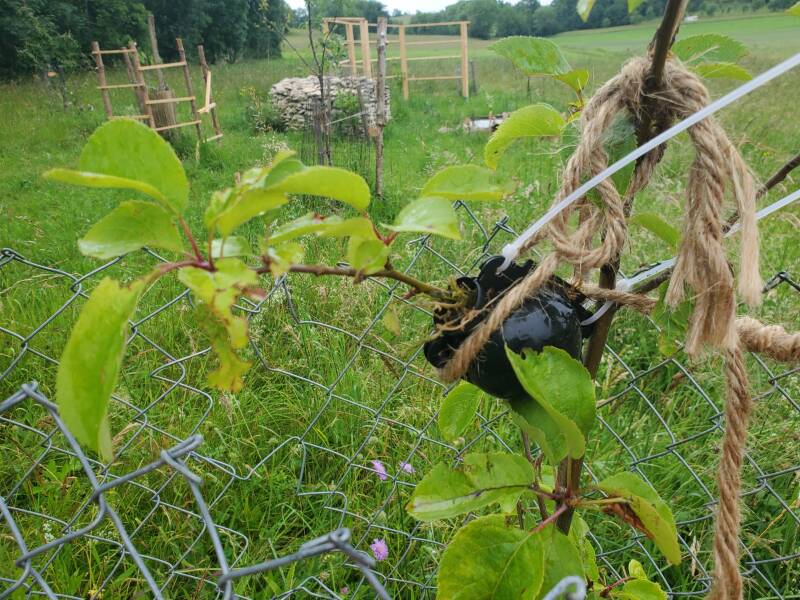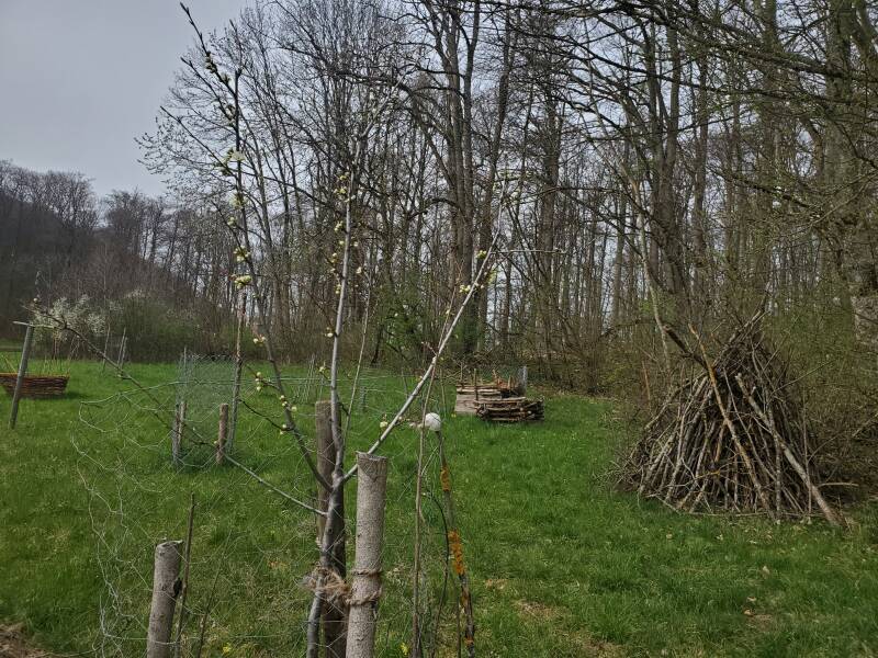 Die Mispel ist der tragendste und Glücklichste Baum im ganzen Waldgarten. Unten bin ich gerade an der Umsetzung einer Ostwindschutzhecke.
