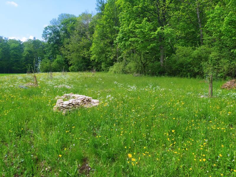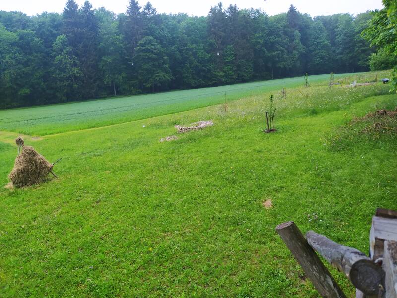 Hier fand unser Sensenmähkurs statt 14.Mai 2022. Ich möchte den Waldgarten ohne Maschinen nur mit Sense und später mit Tieren mähen.