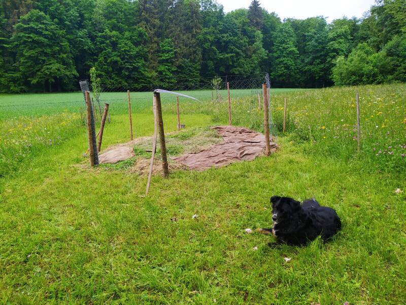 Zuerst habe ich es gemäht und dann mit dem feuchten Heu darüber gemulcht. Ich habe noch Tonnen an Rupfensäcke bekommen und sie auch noch darauf gelegt.